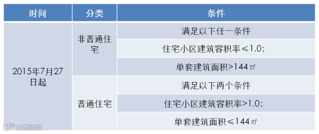 2015年7月27日起,武汉执行新的普通商品住房标准。普通住房应同时满足以下条件:住宅小区建筑容积率在1.0以上;单套建筑面积在144平方米(含)以下。而非普通住宅的标准,就是满足以上“住宅小区建筑容积率在1.0以下;单套建筑面积在144平方米(含)以上”的任一条件即为非普通住宅。