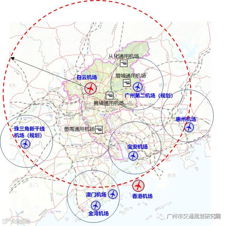 落实国家战略,发展广州国际航空枢纽。协调广州白云、深圳宝安、广州增城(广州第二机场)、珠海金湾、惠州机场、佛山高明(珠三角新干线机场)发展,并强化机场群之间的联络通道,促进粤港澳机场群协调发展。
