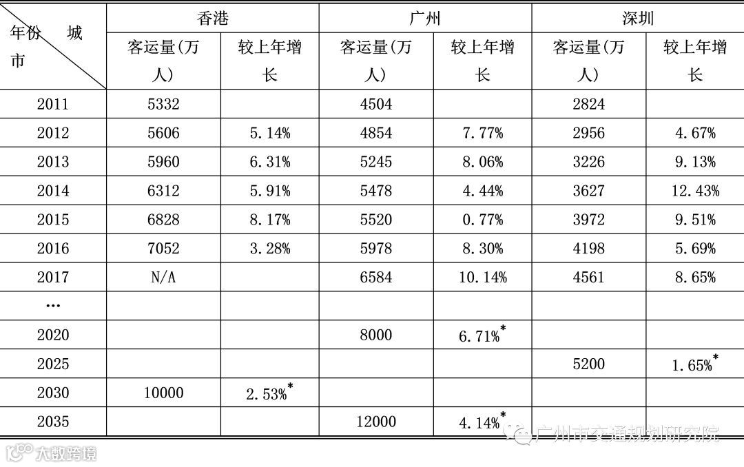 注:广州、深圳机场客运吞吐量历史数据来源于两市统计局网站。香港机场客运吞吐量历史数据来源于香港运输署网站公开数据。广州机场预测数据来源于《广州总体规划(2017-2035年)》草案。香港机场预测数据来源于《香港国际机场2030规划》。深圳机场预测数据来源于深圳机场集团公开数据。带*的增长率为规划年数与最接近年数相比的平均年增长率。