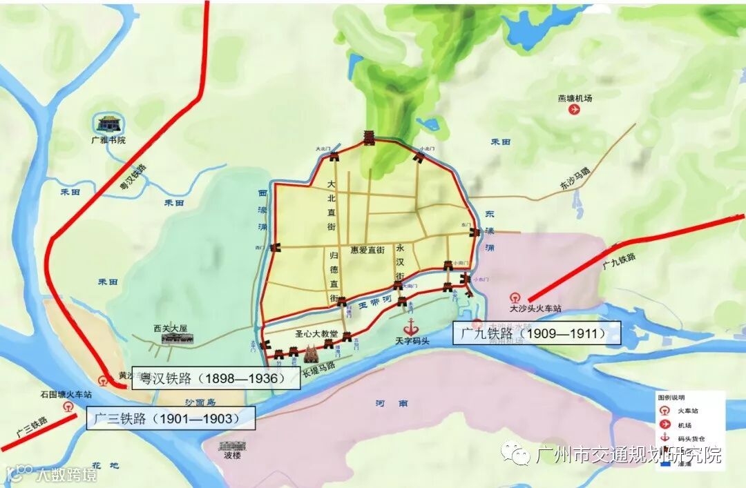 鸦片战争后,英、美、德等国垄断了省、港、澳航线以及近海、远洋航线,黄埔外港处于自然港口的落后状态,虽然在抗战前曾着手改扩建,但依然无法与具有先进技术设备的自由港香港展开竞争,广州国际港口的地位一落千丈,海上贸易迅速萎缩。另外,在孙中山“航空救国”思想推动下,广州先后出现过七大机场,并成立了西南航空公司。但这些机场大多军用,对城市空间格局影响不大。