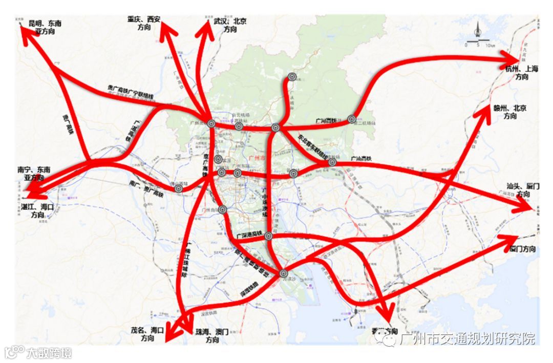 白云机场、南沙港向外围迁移, 更多的作用体现在城市空间的拉开, 分散了中转客流和货流, 而自身巨大的交通流量仍然聚集在一起; 广州南站向南疏解, 但仍然汇聚了广州绝大部分高铁车次(广州北站功能很弱, 客流量仅为南站约4%), 且与机场和CBD 长距离分离, 造成大量长距离跨区客流。