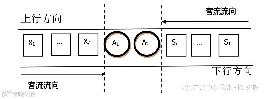 A1和A2为两个连续换乘站, S1-Si为上行方向对连续换乘站有影响的车站,X1-Xi为下行方向对连续换乘站有影响的车站。