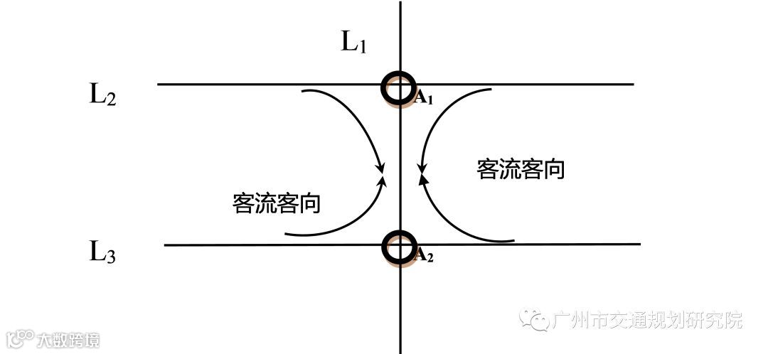 A1和A2为两个相邻换乘站,L1、L2、L3分别为3条相邻的线路,A1为L1与L2的换乘站,A2为L1与L3的换乘站。连续换乘站的邻线同源客流由邻线车站单位时间进站换入连续换乘站的客流组成。对连续换乘站的邻线客流来源进行分析,查找邻线同源客流的关联程度,以邻线乘客出行的OD为基础,结合清分双比例算法模型[7]中乘客出行路径的分布系数,计算得出邻线同源客流系数。反映邻线同源客流的关联程度的系数可按式(2)计算。