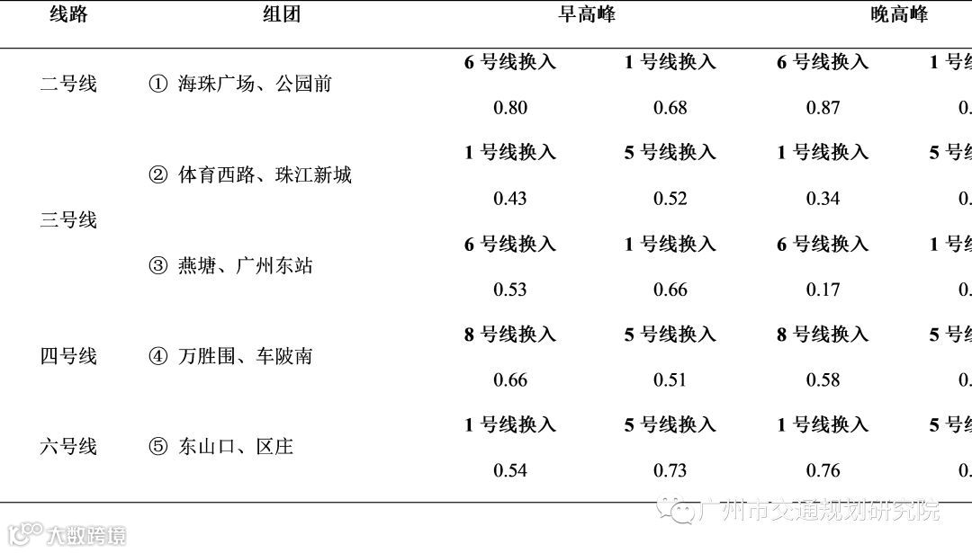 邻线同源客流系数是衡量邻线换入客流对连续换乘站影响程度一个关键指标,当存在某一邻线换入本线的同源客流系数大于0.6时,则表示邻线换入连续换乘站的换乘客流组成具有较高同源性,即连续换乘站关联度较高。将6组组团的客流数据代入邻线同源客流系数公式计算可得出连续换乘站的邻线同源客流系数,见表3。