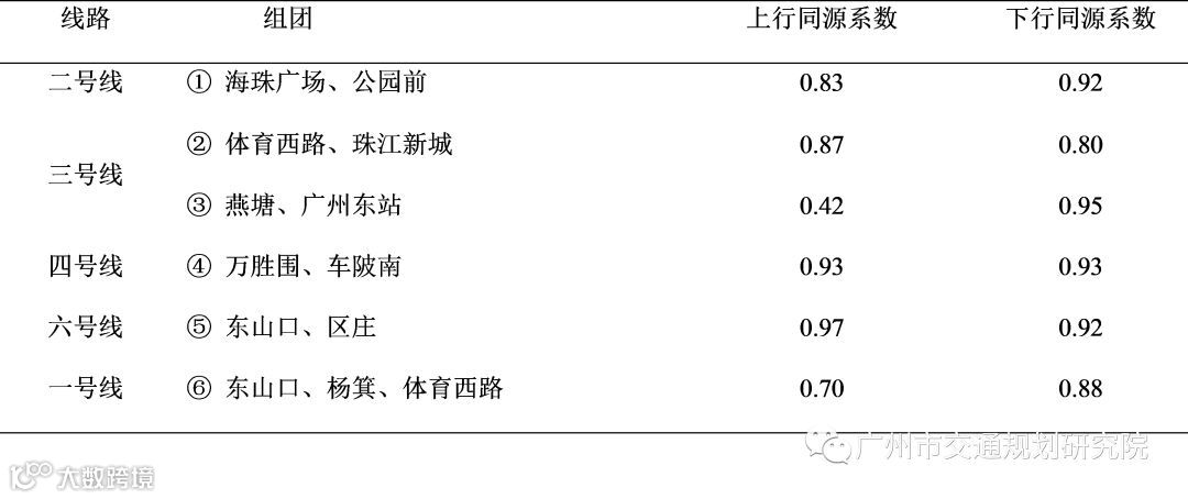 将6组组团的客流数据代入本线同源客流系数公式计算可得出连续换乘站的本线同源客流系数,见表2。通过本线同源客流的分析,得出除燕塘、广州东组团上行方向的本线同源系数低于0.6,其他组团均高于0.6。