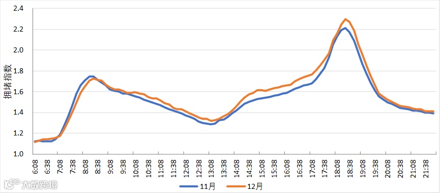 12月工作日晚高峰时段拥堵延时指数为2.05,环比上升4.06%。12月拥堵指数大于2.0的时段出现在18:00—19:00,相比11月(18:00—18:50)拥堵持续时间增加约10 min。12月拥堵延时指数峰值为2.30,发生在18:30,相比11月(2.22)略有上升,而拥堵指数峰值发生时间保持不变。