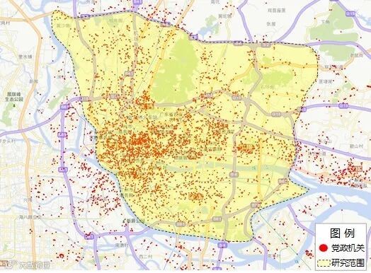 2020年12月1日起,广州市党政机关、事业单位(不含学校、医疗机构)调整工作时间,上班时间由8:30调整为9:00,下班时间由17:30调整为18:00,以期通过“用管理换资源”来缓解广州市交通拥堵。广州市调整工作时间的工作单位约2万个,广泛分布于全市域,其中约65%位于中心城区,故将广州市中心城区设为研究范围(见图1)。