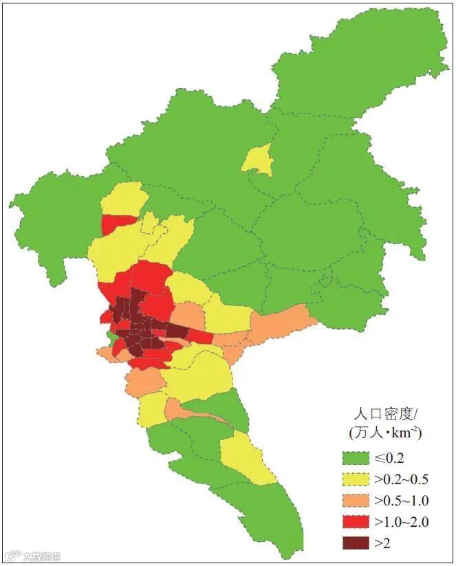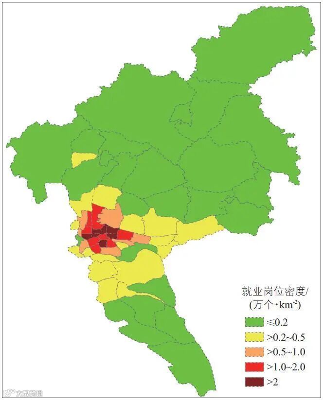 人口密度和就业岗位密度是职住特征最基本指标,体现了指定区域人口和就业岗位的聚集程度。人口密度和就业岗位密度越高,区域发展成熟度也越高,其出行强度也相对越大。计算公式为