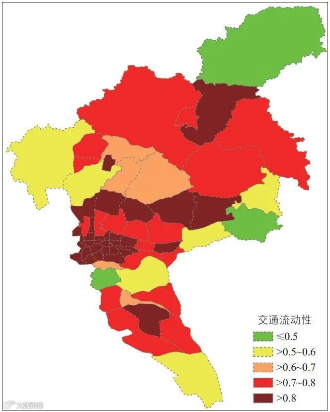 式中:vi 为区域i 的交通流动性;tripij 为从区域i 到区域j 的出行量/人次。