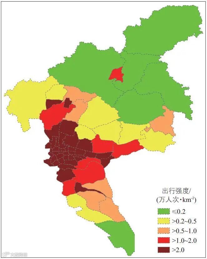 3)就业岗位对出行强度的影响大于居住人口,应以扩大外围就业来促进中心城区人口疏解。
