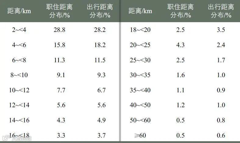 表1 扣除2 km以内出行数据的职住距离分布与出行距离分布
