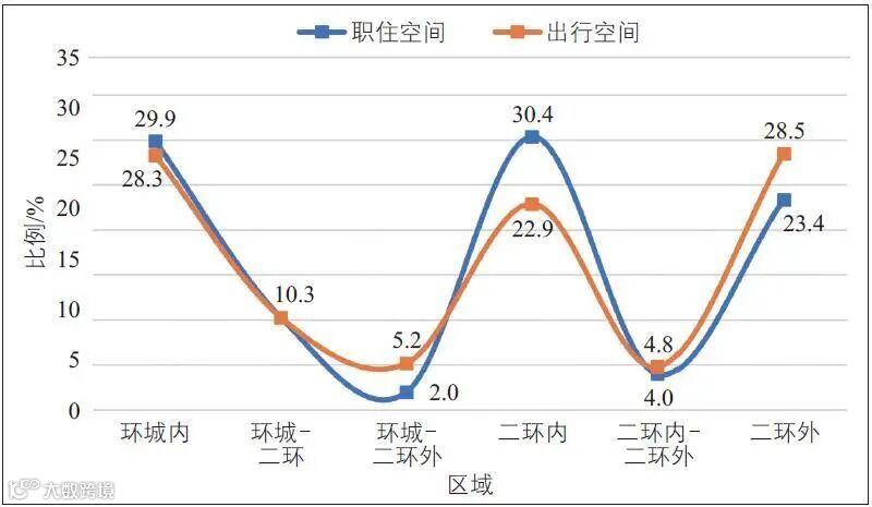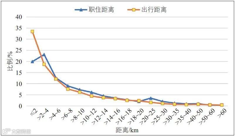 将圈层的职住空间分布与居民出行的圈层空间分布数据进行对比,二者在分布形态上也表现出一致性,二者分布数据的R2=0.94,进一步说明了职住分布不仅是出行距离的主要影响因素,也是出行空间分布的关键因素(见图10)。