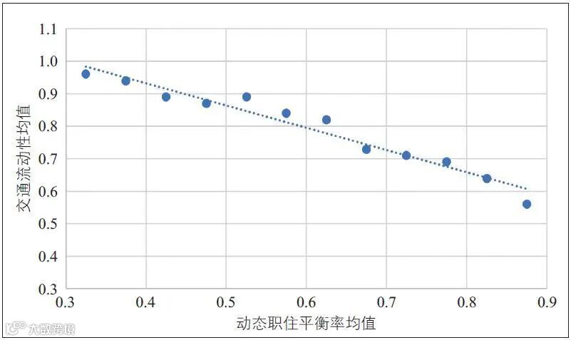 进一步按区间统计,获取不同动态职住平衡率区间的平均交通流动性,对动态职住平衡率和交通流动性均值的回归显示出二者的强相关性(-v=-0.686 1*-ρ+1.206 8,式中:-ρ为某区段动态职住平衡率的平均值;-v为某区段动态职住平衡率对应的交通流动性均值),R2=0.95(见图12)。