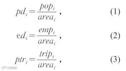 式中:pdi ,edi 分别为区域i 的人口密度/(人·km- 2)、就业岗位密度/(个·km- 2),popi ,empi 分别为区域i的人口数量/人、就业岗位数量/个;areai 为区域i 的面积/km2;ptri为区域i 的出行强度/(人次·km-2);tripi 为区域i 的出行总量/人次。