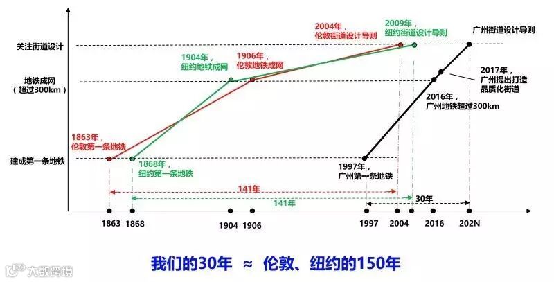 和伦敦纽约交通发展历程比较。广州交通用30多年的时间追赶世界顶尖城市的水平。到2040年,广州将实现“建成与全球顶级城市相匹配的交通体系”的愿景。