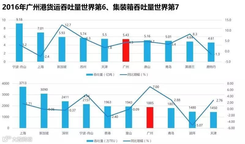 2016年广州港的货运吞吐量和集装箱吞吐量分别达到世界第6和第7,但是在国际航运中心的排名不高,需要实现从量到质的提升。