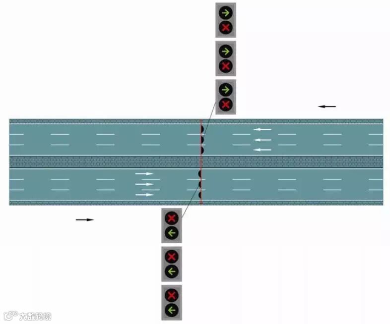 为实现这种分车道的控制方式,需要在进口道每条车道上一一对应设置一组信号灯控制,同时为车道及信号灯加上编号,并加装“按车道信号灯行驶”标志牌,能让驾驶员清晰知道需按照信号灯指示依次放行。