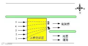 某路口北往南方向在上桥位由5车道车流汇入2车道行驶,上桥位形成较窄的瓶颈点。该方向平峰期车流不大,交织冲突相对不严重,高峰期由于车流量较大,冲突严重,通行效率低下造成直行方向交通拥堵严重,整体影响路段北往南车流疏散,为典型的“过桥容易上桥难”问题。