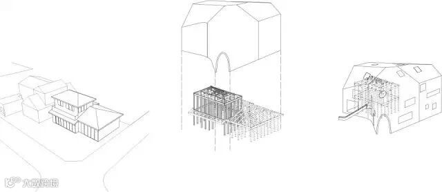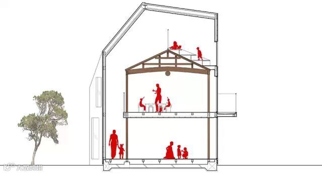 改造从如何处理这幢105平方米的二层小住宅开始。与周围的房屋一样,原建筑本是从房屋建设公司购买来的装配式成品,为全木结构。在勘察了实际情况以后,MAD决定保留并利用这座住宅的主体木结构,使它成为新建筑结构的一部分。被保留的坡屋顶木框架不但造就了有趣的室内空间,对房屋的主人,幼儿园的经营者来说,也是对家的一种纪念。
