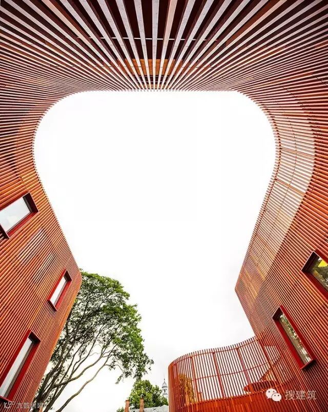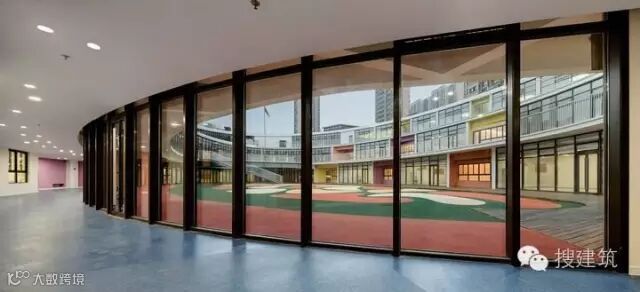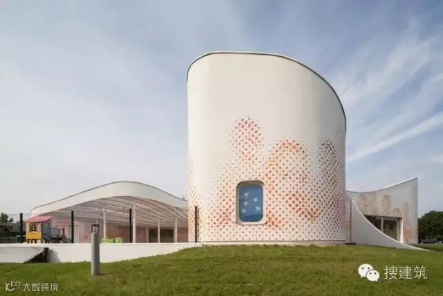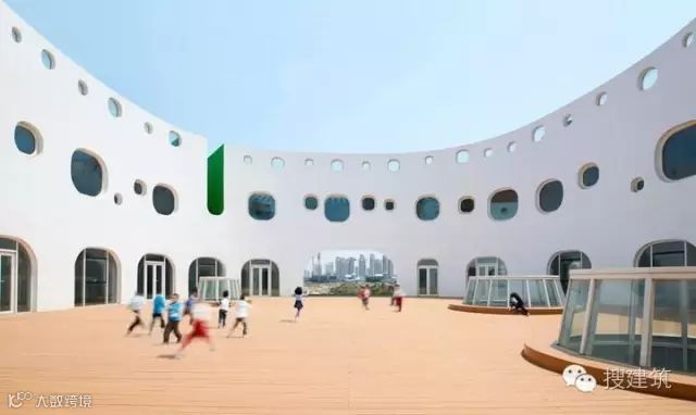天津·LOOP国际幼儿园(循环幼儿园) SAKO architects 这座圆形城堡似的LOOP国际幼儿园位于天津,有45000平方尺。建筑以白色墙壁为主,墙面上开设了大小不同的类似飞机窗口一样的窗户,不同功能的窗户被刷上了不同的颜色,让人能容易地分辨出房间的使用功能。整个的建筑空间是一个环形,设计团队希望孩子们在这里体会到真正的自由与欢乐。