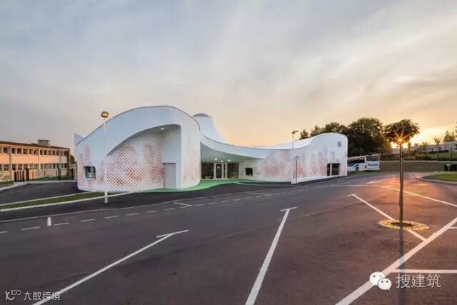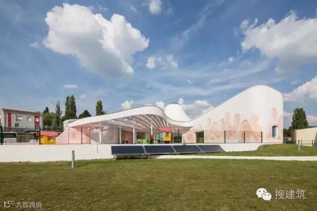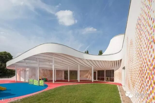 该建筑采用了流线形的设计,并与现有的道路形成了动态的关系。其次的建筑造型将园林绿化景观元素充分的融入了进来,从而使幼儿园与西面的购物中心和南面的社区中心合为一体,形成了一个高质量的与舒适的广场空间,非常适合人们在这里散步娱乐。