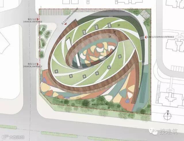 与此同时,建筑的侧面面朝马路,因此需要考虑屏蔽交通带来的噪音,在设计中我们在起伏的地面上种植了绿色植物景观,巧妙的将幼儿园和马路分离开来,有效地降低了交通噪音给幼儿园带来的影响。