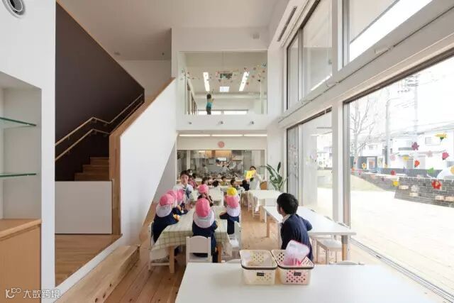 在幼儿园的内墙上,空间是相互关联的,非常开放。孩子们从二楼的自习室就能够观察和了解他们的饭菜正在准备在从大厅厨房。