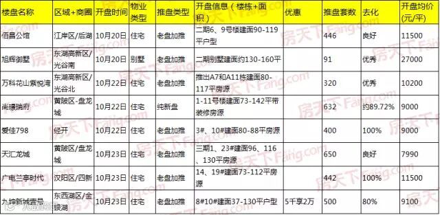 据统计上周(10月17日-10月23日)武汉共有8盘入市,共计推出约3481套房源,整体去化情况都不错。其中尚璟瑞府1个纯新项目首开,其余7个项目均为老盘加推,主城区有5个项目,分布在汉阳区、江岸区、东湖高新区、经开区,其他3个分布在东西湖区、黄陂区。上周大汉阳区就有2个楼盘开盘去化率100%,分别是广电兰亭时代和爱佳798。值得一提的是广电兰亭时代是23日晚上在售楼部开盘,推442套房源,主推14、19#建面73-112平户型。