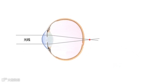 随着眼轴慢慢生长,聚焦点正好落在视网膜上时,就是正视眼,看东西是清晰的;当眼轴继续生长,聚焦点落在视网膜前面时,就形成近视了。通常来说,孩子生长发育最快的6-12岁阶段,眼轴平均增长1mm,近视大约会增加175度。