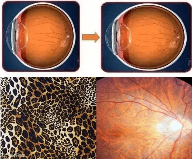 豹纹状眼底是高度近视患者最为常见的眼底病变之一。豹纹状眼底是指由于眼球加长,视网膜血管变细、变直,同时脉络膜毛细血管也伸长,从而影响了视网膜色素上皮的营养,使浅层色素消失,脉络膜血管外露,形成豹纹状眼底。