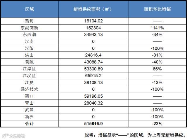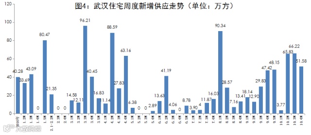 10月第四周,住宅供应量为51.58万方,排在前三分别为江汉区6.60万方,硚口区5.92万方,江岸区5.33万方。