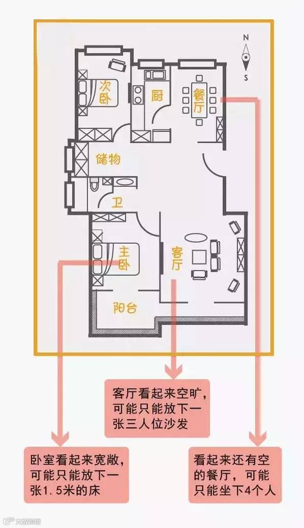 户型图上的家具一般都会比实际尺寸小,造成“空间很大”的感觉。这时记得向地产商要求看户型的实际尺寸。