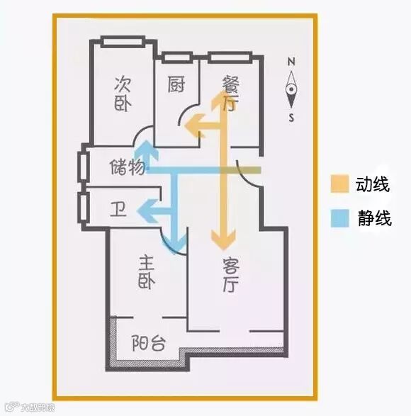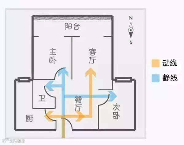分析:动区&静区的走动路径几乎没有交叉,两者各得其所。但次卧到卫生间会经过大门,稍有点欠缺。