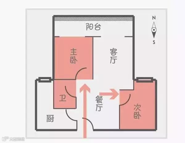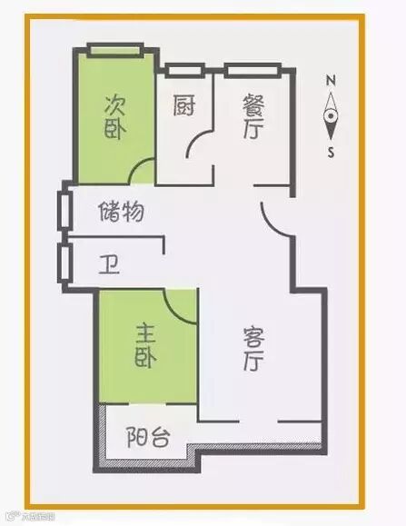 分析:从方位上看,两个卧室隐蔽性都较好,客厅、厨房等活动区域不能直接看到卧室里面。不足之处是,去卫生间还是会经过主卧。