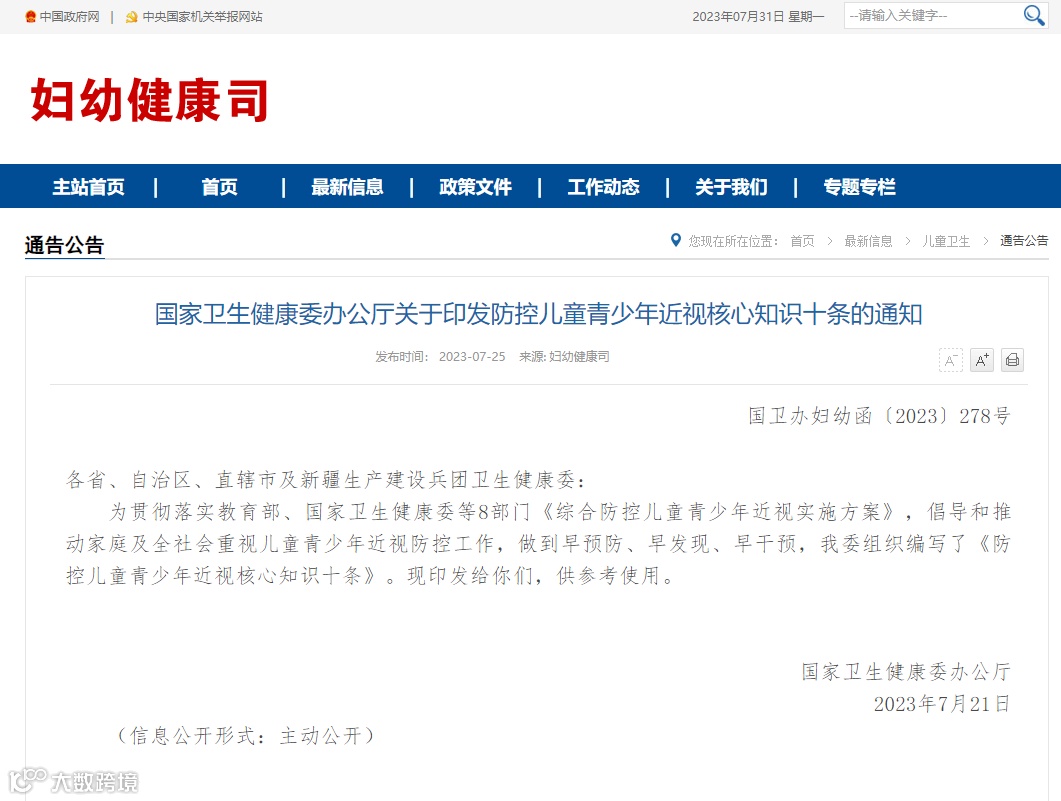 为贯彻落实教育部、国家卫生健康委等8部门《综合防控儿童青少年近视实施方案》,倡导和推动家庭及全社会重视儿童青少年近视防控工作,做到早预防、早发现、早干预,我委组织编写了《防控儿童青少年近视核心知识十条》。现印发给你们,供参考使用。