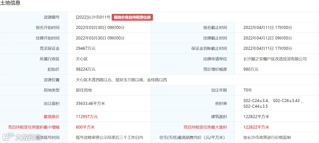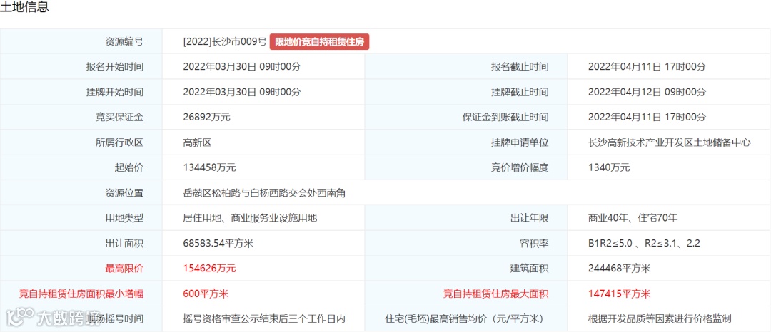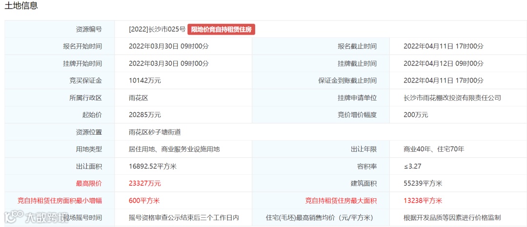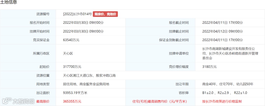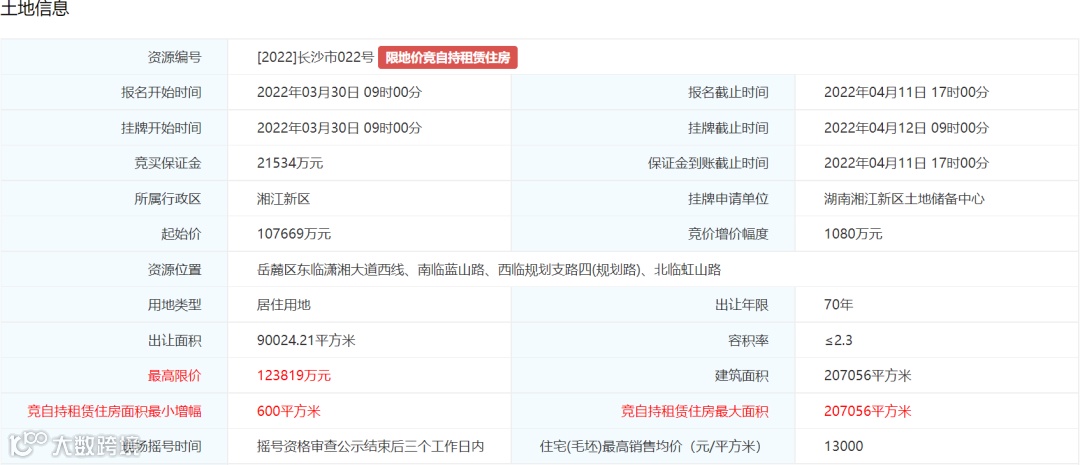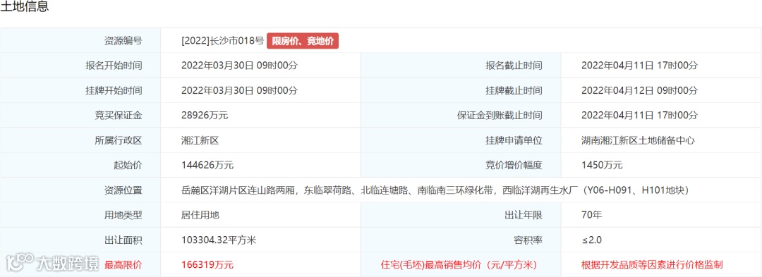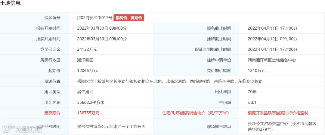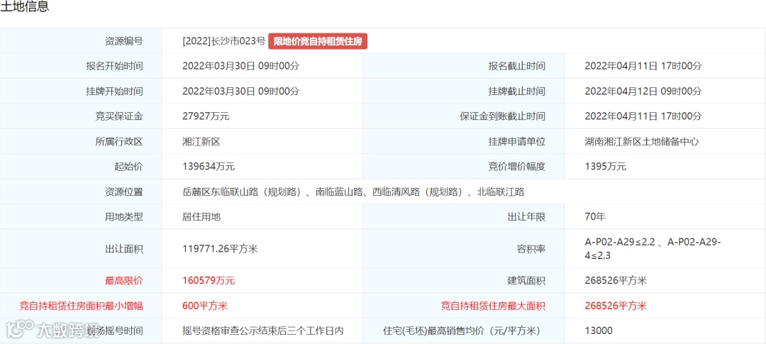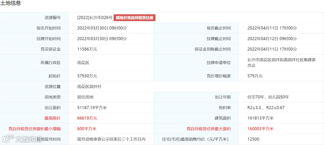 4. 土地挂牌最高限价为160579万元万元,住宅(毛坯)销售均价不超过13000元/平方米。
