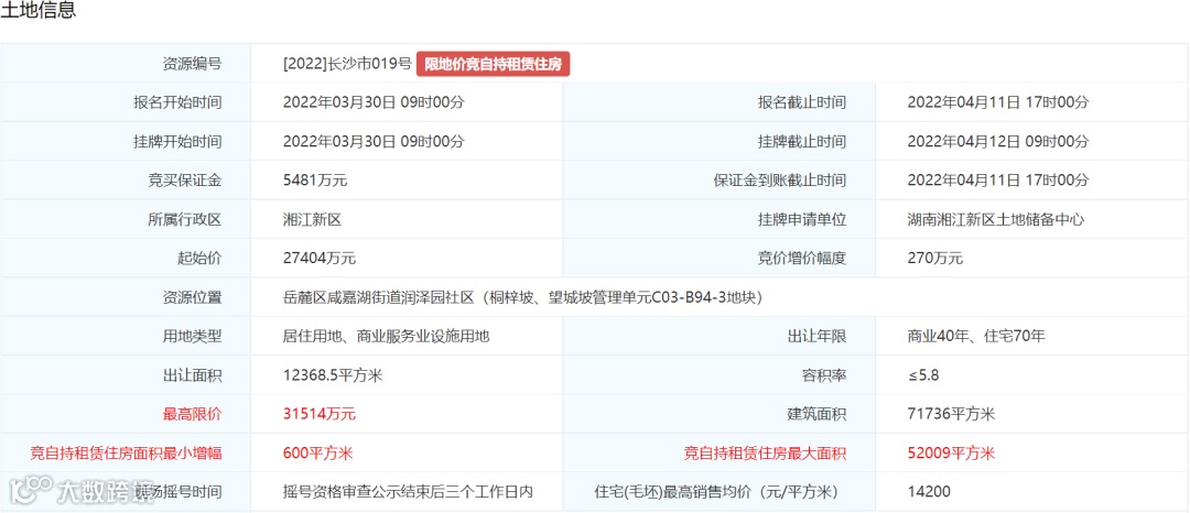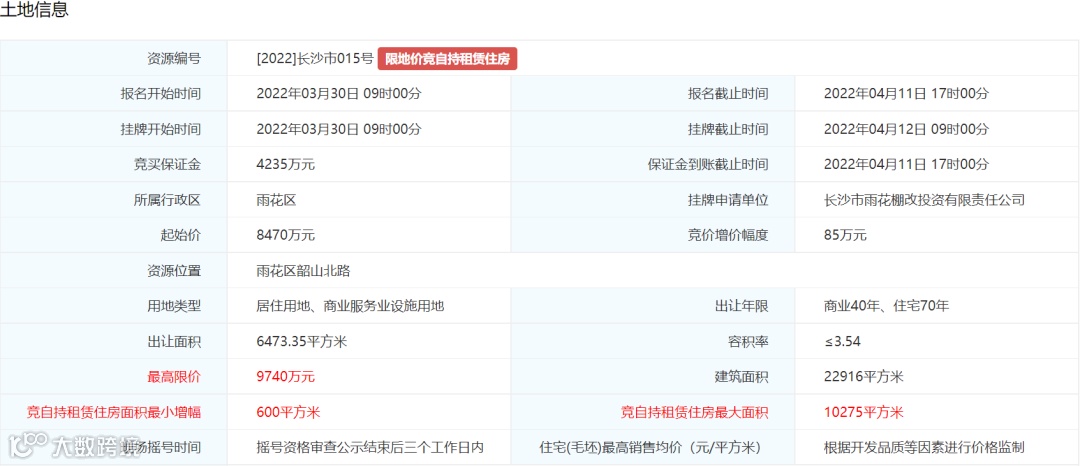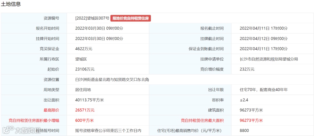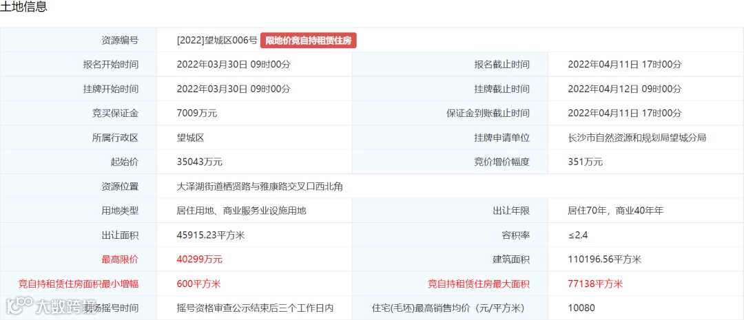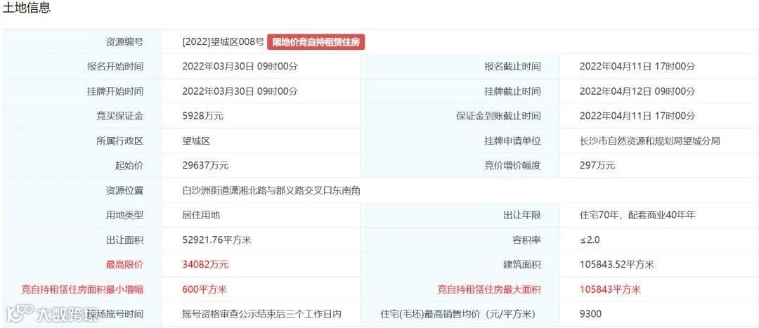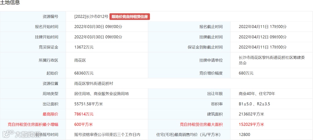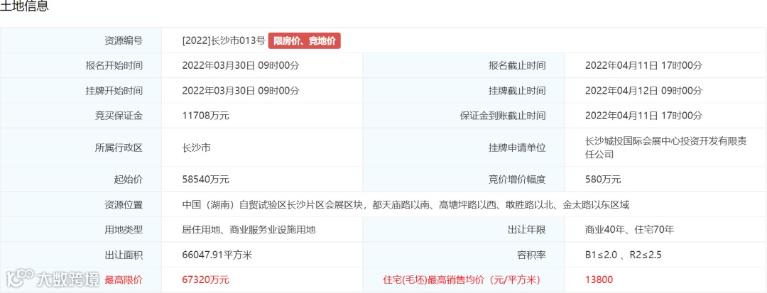 3.土地挂牌出让最高限价为67320万元,住宅(毛坯)销售均价不超过13800元/平方米。