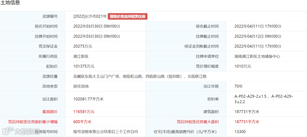 4. 土地挂牌最高限价为116581万元,住宅(毛坯)销售均价不超过13300元/平方米。