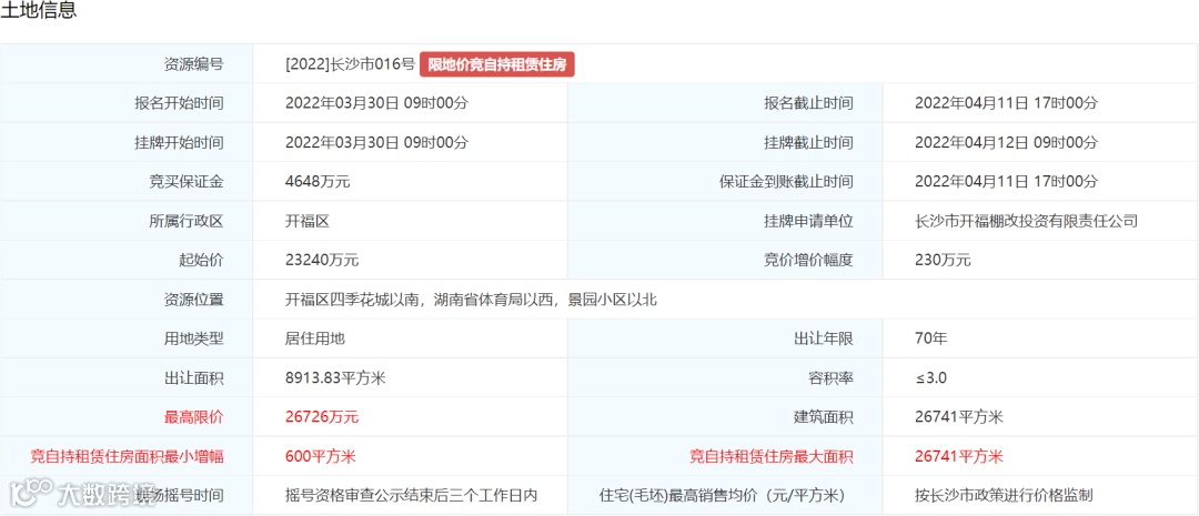 1.该宗地须竞自持租赁住房,最大可竞自持租赁住房面积26741平方米,竞报幅度按600平方米/次确定。