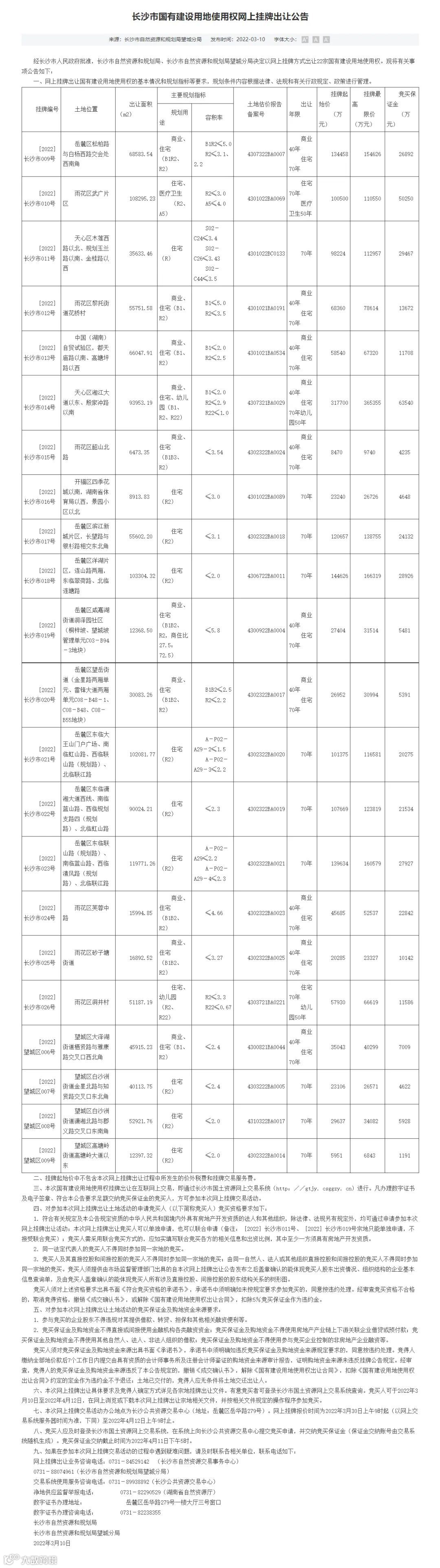 2022年3月10日长沙市国有建设用地使用权网上挂牌出让公告发布,3月30日相关土地正式开始挂牌,长沙市第一批集中供地竞拍开始报名。报名截至日期2022年4月12日。