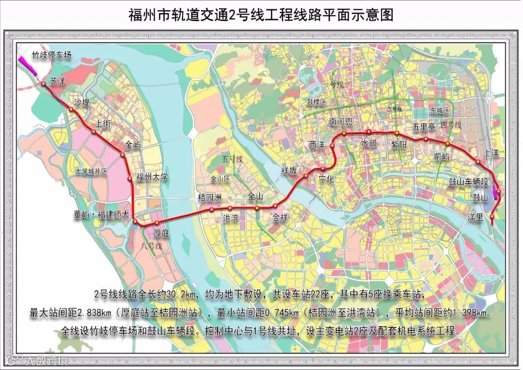 福州二号线工程整体呈东西走向,西起闽侯县苏洋村,东至晋安区鼓山镇,沿东西向城市发展轴,途径上街大学城片区、金山片区、中心城区及鼓山片区。沿途设22个站点,在中心城区形成福州一号、二号线十字形轨道交通主骨架。福州二号线串联了主要文教科研区、主要工业区、福州市历史文化中心、大型居住区,有利于疏解城市东西向客流,有力地支持了福州市近期规划重点发展地区。