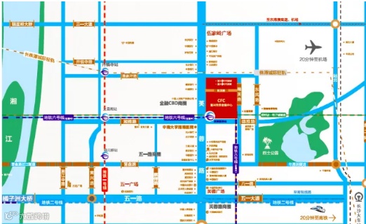 富兴世界金融中心坐拥CBD核芯地段,地处长沙中轴芙蓉中路,雄踞长沙金融命脉之处,拥有立体交通护航行。地铁6号线芙蓉中路站(在建中)与本项目商业地下负二层无缝对接,距离地铁1号线文昌阁站约800米。桐梓坡---鸭子铺过江隧道(规划中)、城际轻轨、27条公交等交通网络纵横交错,形成众星捧月之势。立体交通保障出行,以便捷执掌都会,无缝接驳全国。