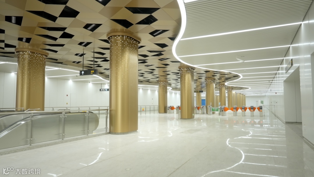 琼姬墩站设计契合园区湖东CBD商业氛围,打造以“繁华之上“空间设计理念,利用主色调“金色”寓意园区的繁华。车站与中塘公园、地下空间项目同步规划、同步设计、同步实施,地面设施与公园景观相融合,轨道交通与地下商业空间无缝对接,彰显城市中心活力。