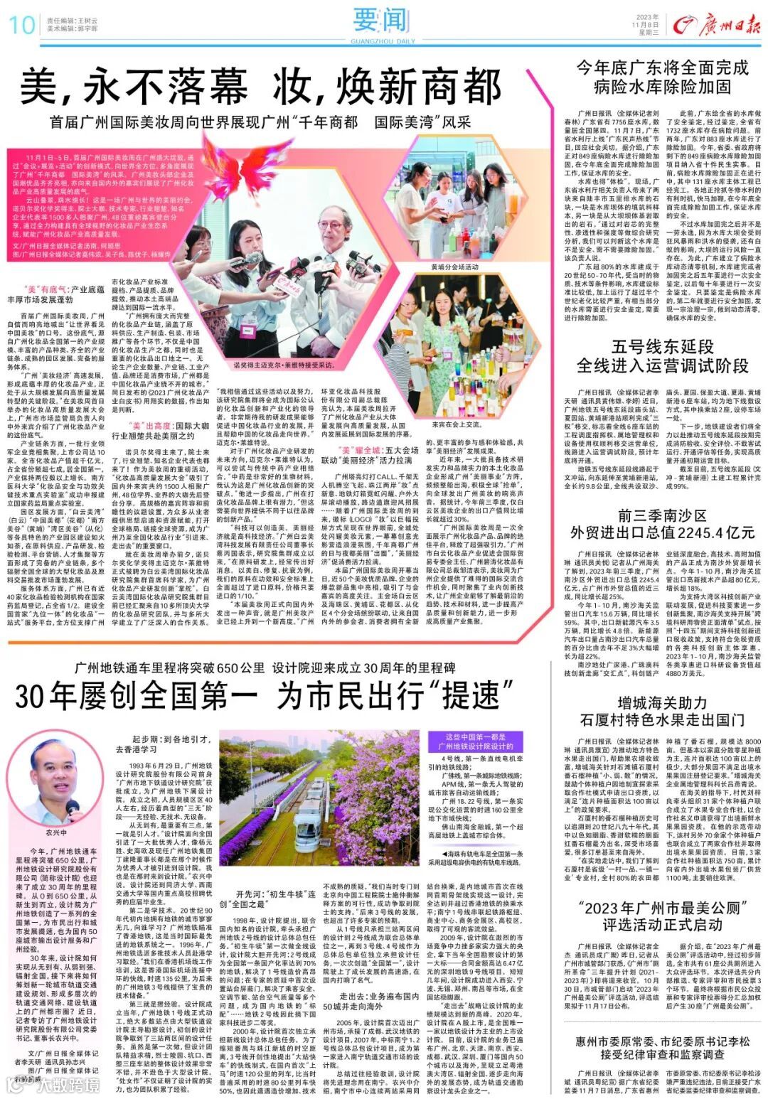 11月7日,《广州日报》发表了题为《30年屡创全国第一,解码广州地铁设计》的报道,专访广州地铁设计研究院股份有限公司党委书记、董事长农兴中,聚焦30年来设计院如何实现从无到有、从弱到强、辐射全国,接下来如何筹划新一轮城市轨道交通建设规划、形成多层次的轨道交通网络、建设轨道上的广州都市圈。