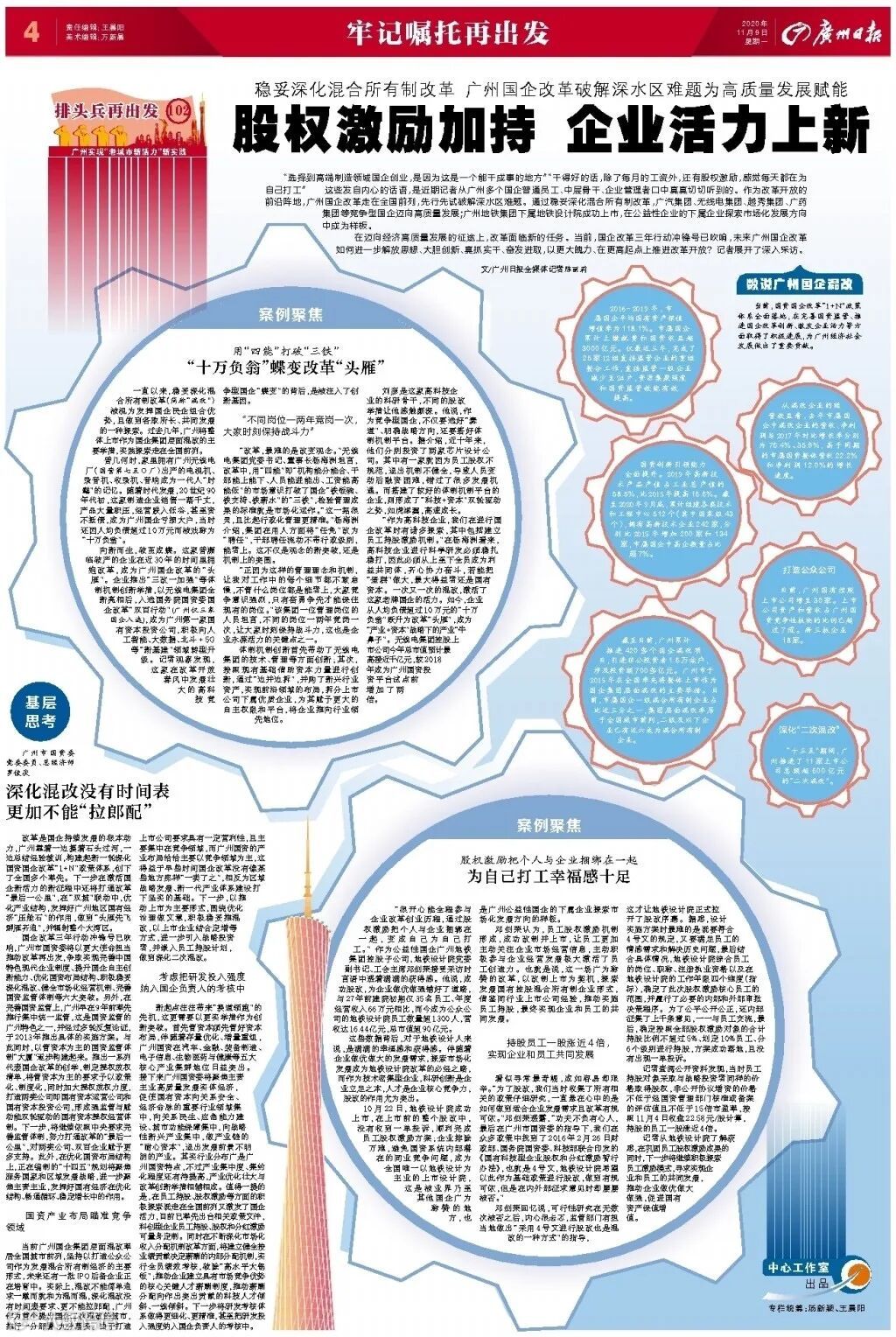改革是国企持续发展的根本动力,广州靠着一边摸着石头过河,一边总结经验教训,构建起新一轮深化国资国企改革“1+N”政策体系,创下了全国多个率先。下一步在激活国企新活力的新征程中还将打通改革“最后一公里”,在“双城”联动中,优化产业结构,发挥好广州地区国有经济“压舱石”的作用,做到“头雁先飞群雁齐追”,并辐射整个大湾区。