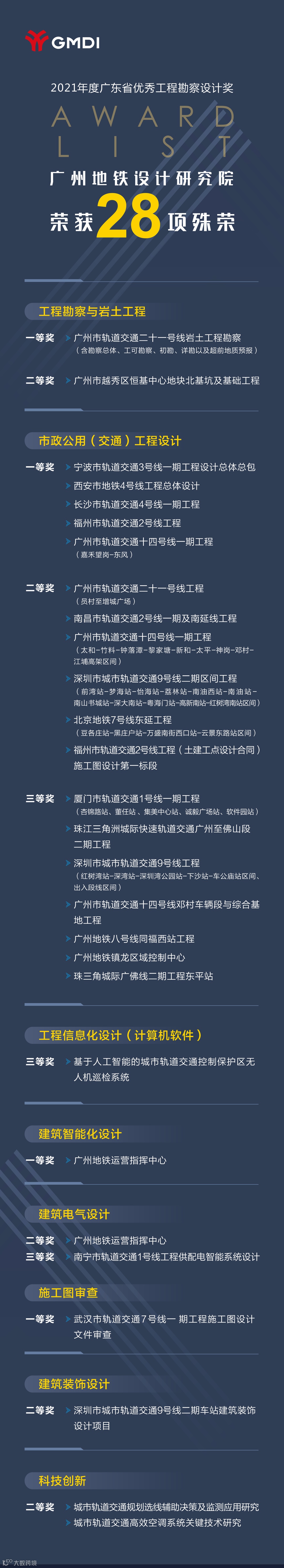 本次广州地铁设计研究院获奖项目涵盖工程勘察与岩土工程、市政公用(交通)工程设计、工程信息化设计(计算机软件)、建筑智能化设计、建筑电气设计、建筑装饰设计、施工图审查、科技创新等多种类别,充分展现了广州地铁设计研究院综合设计实力、专项领域积淀以及科研创新能力。