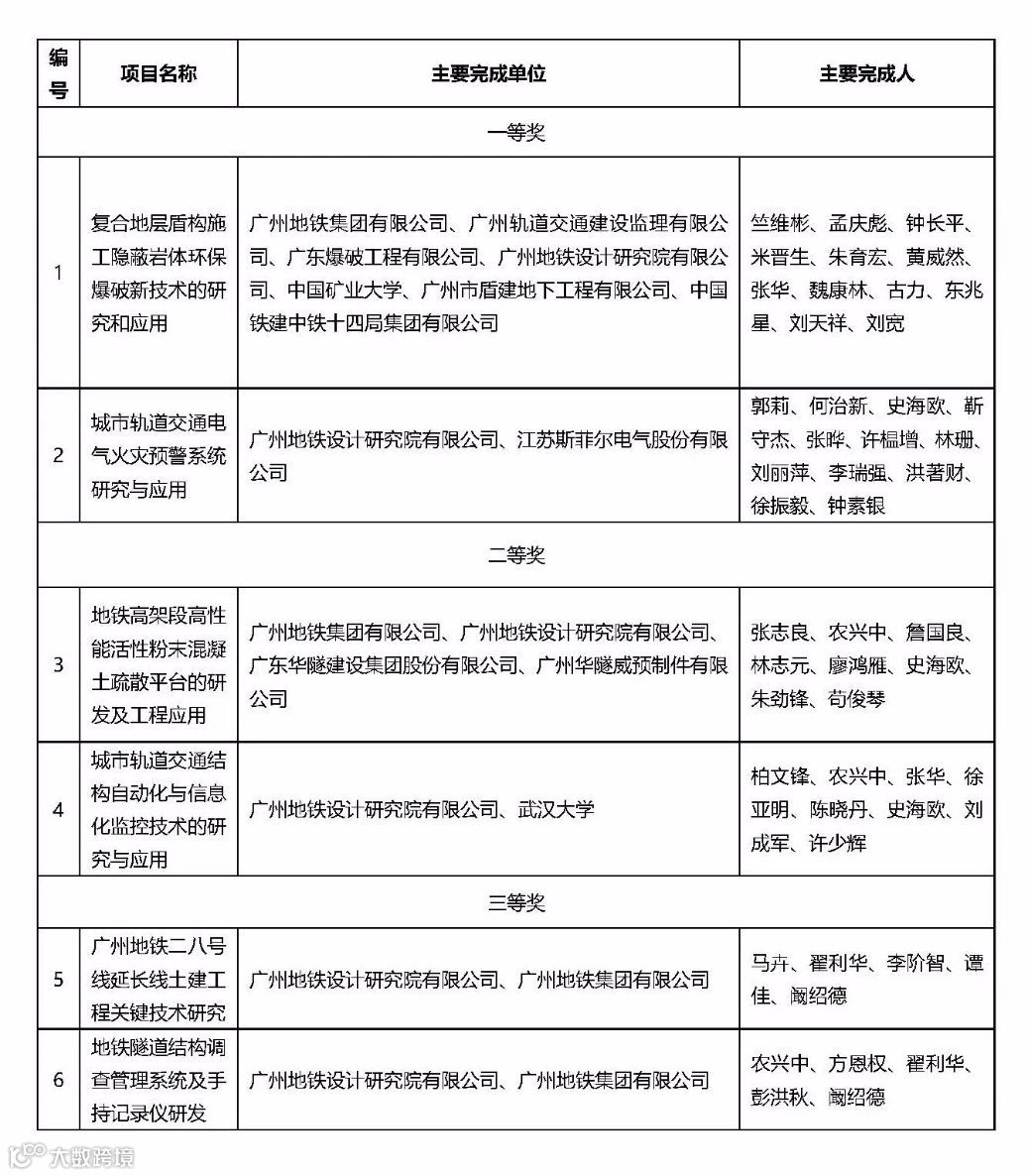 经过广东省土木建筑学会评审委员会专家评审及奖励委员会审定。我院牵头设计或参与的复合地层盾构施工隐蔽岩体环保爆破新技术的研究和应用,城市轨道交通电气火灾预警系统研究与应用,地铁高架段高性能活性粉末混凝土疏散平台的研发及工程应用,城市轨道交通结构自动化与信息化监控技术的研究与应用,广州地铁二八号线延长线土建工程关键技术研究,地铁隧道结构调查管理系统及手持记录仪研发共计6个项目获得一等奖2项,二等奖2项,三等奖2项。