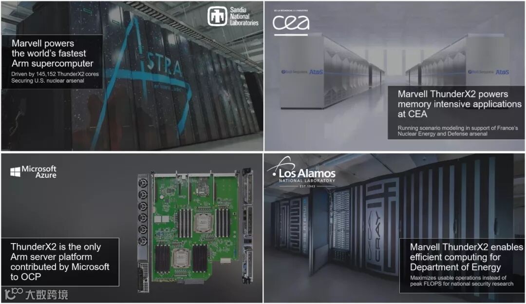 截止到现在,ThunderX2已经有诸多应用实例。美国能源部旗下桑迪亚国家实验室的超级计算机“STRA”,就配备了145152个ThunderX2核心,是目前最强大的Arm超算,主要用于美国核武器研究;美国洛斯阿莫斯国家实验室采用ThunderX2核心提高超算可用性,而不是一味追求峰值性能;法国原子能机构CEA的超算系统同样采用基于ThunderX2的处理器,用于核能源、国防相关;同时,ThunderX2也是微软向OCP提供的唯一Arm服务器平台。