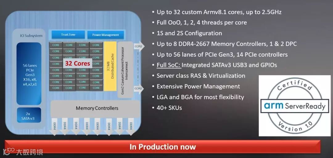 2014年,Cavium(后被Marvell收购)推出了基于Arm架构设计的服务器芯片ThunderX,这是全球首款至强E5级别的 Arm 服务器芯片,也是当时业界唯一的能支持双路架构的Arm服务器芯片,产品拥有最多高达48个的定制Armv8内核和最多472位DDR3/4内存控制器等优势,对存储、网络和安全等进行了特定的优化。