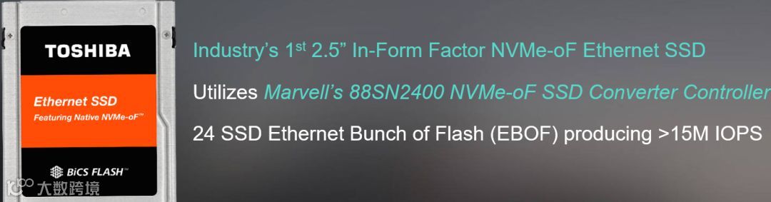 据Nigel Alvares介绍,东芝存储器公司目前已推出了由Marvell NVMe-oF SSD转换控制器88SN2400提供支持的原生NVMe-oF以太网固态硬盘SSD,这是世界第一首款以太网直接连接SSD。双方产品的完美结合将有助于展示NVMe-oF以太网SSD对于数据中心而言的重要价值。
